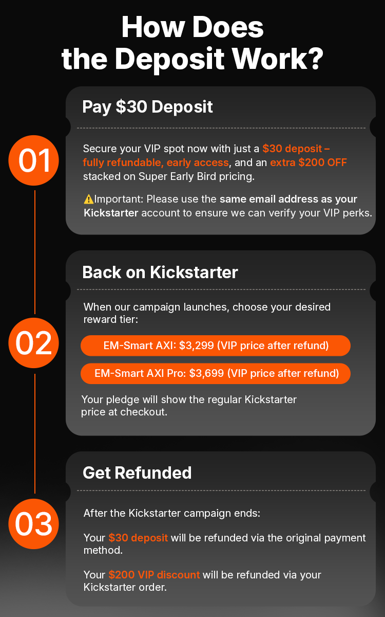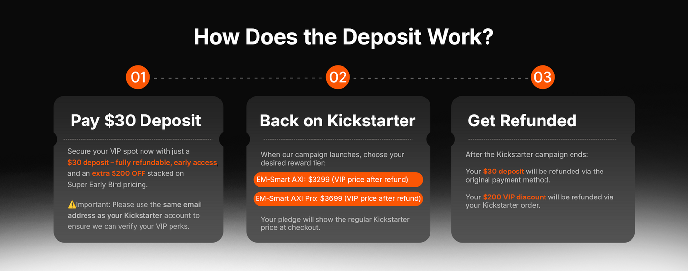 Placing a $30 VIP deposit secures your exclusive perks: early access + an extra $200 OFF on top of Kickstarter’s Super Early Bird pricing.