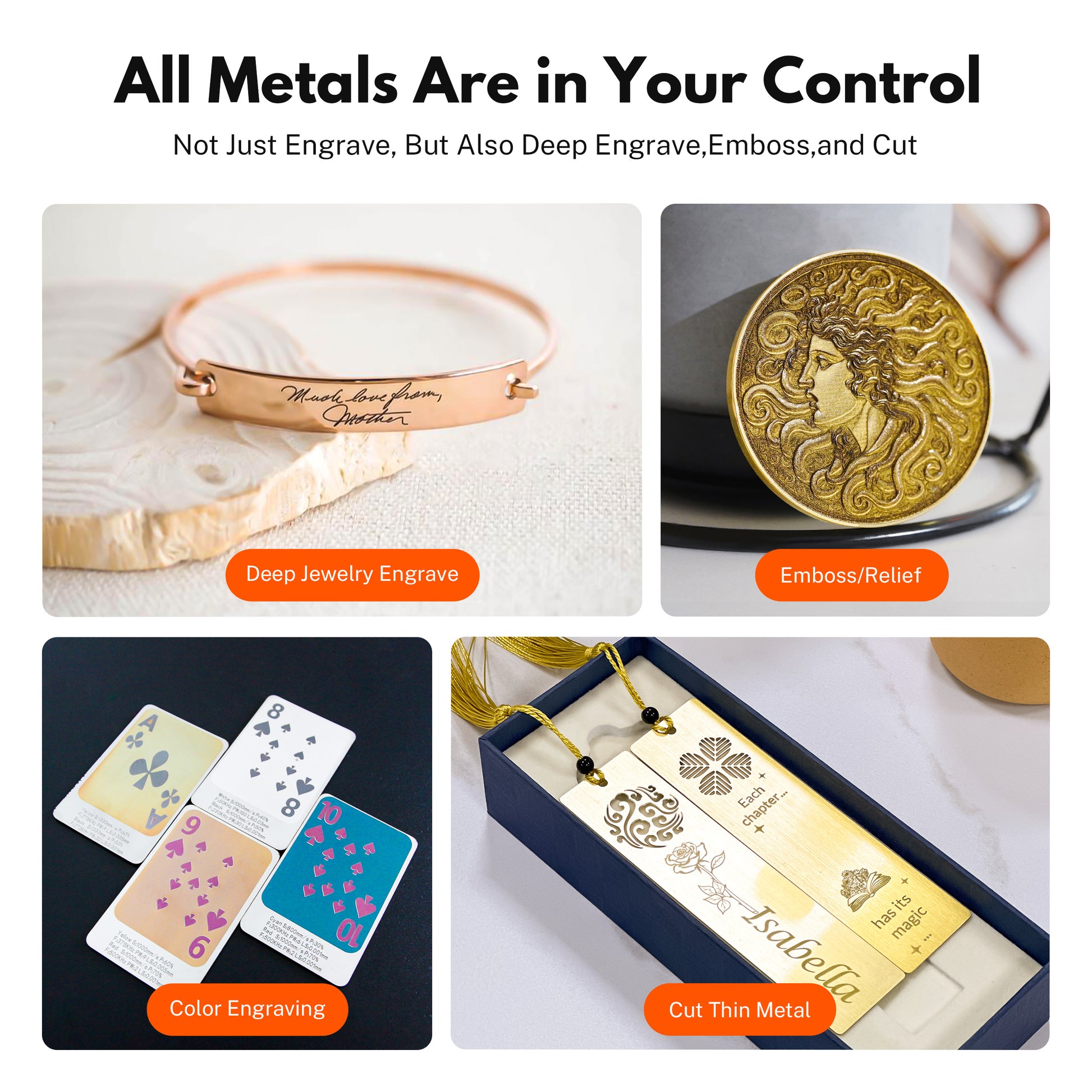 Bring your designs to life with rich colors on stainless steel and titanium, expanding your creations beyond black and white. Bring your designs to life with rich colors on stainless steel and titanium, expanding your creations beyond black and white.
