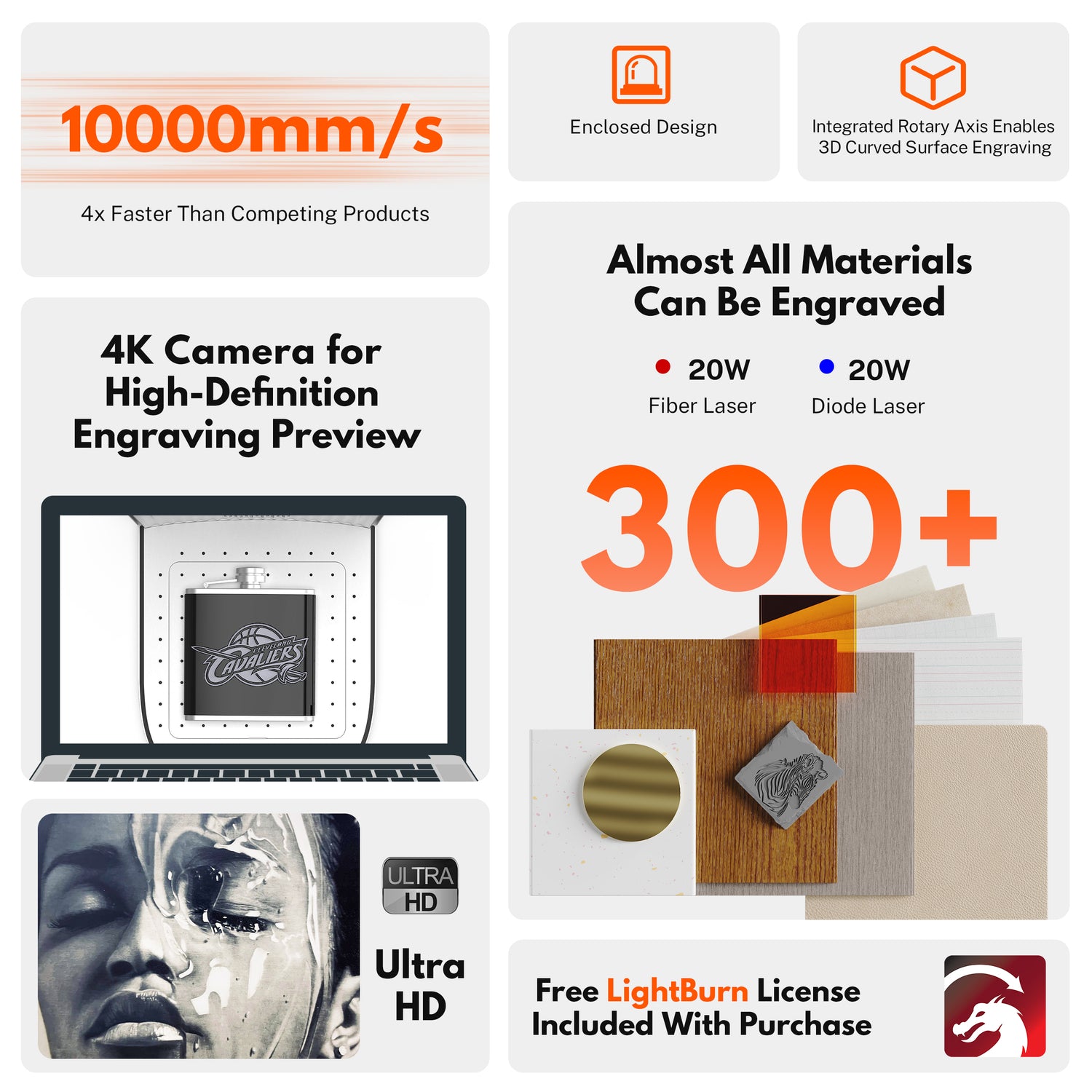 Equipped with a 20W fiber laser, it can deeply engrave metal with a 3D effect at a motion accuracy of ±0.002mm. Additionally, it can cut metal up to 0.53 mm with ease.